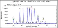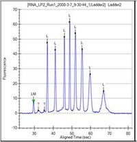 4. A sizing ladder (see the figure below), which is a mixture of RNA fragments of different known sizes, is run first from the ladder vial. The concentrations and sizes of the individual nucleotides present in the ladder are predetermined by the assay. A dye matching the lowest peak in the ladder is run with each of the samples. This lower marker, labeled LM in the RNA sample (see figure below) is used to align the ladder data with data from the sample wells.