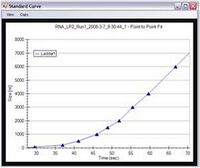 5. The ladder is analyzed and a standard curve of migration time versus RNA size is plotted from the RNA ladder by interpolation between individual RNA fragment size/migration points.
