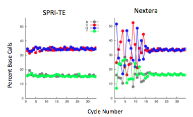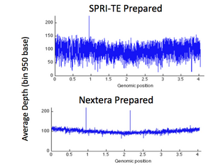 The Nextera transposase does exhibit a mild GC-insertion bias, shown by the increase in percent of the first few bases. This, however, did not affect the sequencing coverage. The Nextera-prepared sample has very consistent genome-wide coverage, while the SPRI-prepared samples have a more variable coverage density.