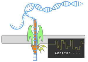 During library preparation, adaptor consisting of motor protein and tether is ligated to the ends of RNA or DNA with tether furthest from the template. Adaptors can also be bought with barcodes for multiplexing. If tether interacts with a nanopore successfully, motor protein will shift the molecule into and through the protein nanopore. A voltage is set across the nanopore and the current will shift as base pairs move through the pore. Nanopores are arranged in an array such that multiple molecules can be sequenced simultaneously. Sequencing and demultiplexing all occur in real time providing fast5 or fastq.
