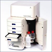 The Agilent 2100 BioAnalyzer is a microfluidics device that performs size determination and quantification of small samples of DNA, RNA, or Protein. In addition, the BioAnalyzer is able to perform flow cytometry on small numbers of cells. Samples can be run on the BioAnalyzer by individual users; the BioMicro Center does not currently accept sample submissions to be run on the BioAnalyzer by BMC staff.