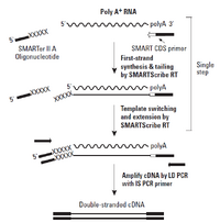 For samples with less then 50ng of input, the BioMicro Center utilizes the Clontech SMARTseq v4 system. This system differs from the TruSeq chemistry in that it begins with cDNA generation using polyT priming followed by strand switching oligos. The use of polyT priming requires the RNA to be of high quality. Full length double-stranded cDNAs are generated and amplified by PCR. These cDNAs are then prepared into Illumina libraries using the NexteraXT chemistry from Illumina. Data from this system is of similar quality to samples created with Illumina TruSeq chemistry but is not stranded. Single samples can be prepared by hand. Batches of 24, 96 or 384 samples can be prepared using the older SMARTseq v2 chemistry on the Mosquito HV resulting in significantly lower costs/sample.