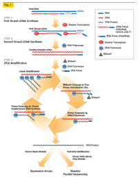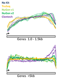 For samples with less then 100ng of input and restricted input amounts, our kit of choice is the NuGEN Ovation. This kit utilizes non-random nonamers designed to not amplify ribosomal RNA to create double stranded cDNA fragments. The fragmented cDNA is then transferred to the SPRIworks for the remainder of sample preparation. The downside of this kit is that the non-random nonamers cannot amplify all areas of the genome and certain portions of genes are often lost. Still, for many samples, this kit is the only way to generate RNAseq libraries. |