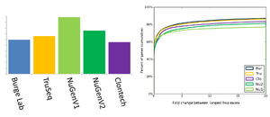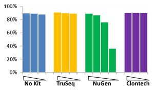 For samples with less then 100ng of input, the BioMicro Center utilizes the Clontech SMARTer system. This system differs from the TruSeq chemisry in that it begins with cDNA generation using polyT priming and proprietary chemistry. The use of polyT priming requires the RNA to be of high quality. Full length double-stranded cDNAs are generated and amplified by PCR. These cDNAs are then fragmented and transferred to the SPRIworks for the remainder of sample preparation. Data from this system is of similar quality to samples created with Illumina TruSeq chemistry. |