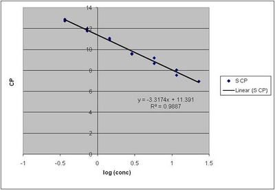 - Use the standard curve equation to calculate the log concentration of your unknown samples (x = log concentration, y = Cp determined by RT-PCR)