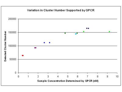 Simultaneous test. Samples were tested for RT-PCR and clustered for sequencing on the same day. Their DNA concentration and the correlation of the concentration as measured by RT-PCR was then compared to their cluster number. All DNA samples had been thought to be at 10nM as determined by Qubit quantification.
