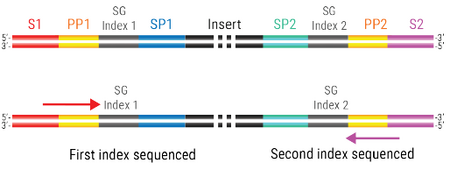 - Indexes are read off flow cell binding regions, S1 and S2. This is unlike modern Illumina platforms, which read off of sequencing priming regions of the final library (SP1 and SP2 in diagram above). For standard lane-by-lane requests, the first index will be read off the S1 region of the final library, and index 2 will be read off the S2 region. Compared to a typical Illumina library, a Singular index 1 would be the reverse compliment of the i5 index, whereas index 2 would be the reverse compliment of the i7 index.