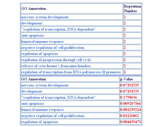 As it can be followed from the table, anti-apoptotic and regulation of apoptosis terms gave highly low p values of a hypergeometric test. Another significant term is humoral immune response, however when we searched it in pubmed, we got: