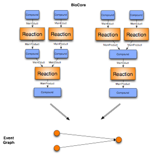 The bipartite reaction graph is a one-to-one mapping of the object-oriented data model BioCore. The event and participant classes are mapped onto nodes. The edges are defined by the roles the participants play in a certain event. An example is given above (Figure 1). The representation doesn't contain any ambiguity, however it consists of two kinds of nodes, event and participant nodes. For different analyses this kind of representation is not applicable. Therefore, the biochemical network library allows to represent the data as a compound graph or its dual form, an event graph. Both graph representation simplify the network, thus contain some ambiguity which make them inapplicable in some situations. Depending on the kind of analysis a user can decide which kind of graph representation is suitable for the application.