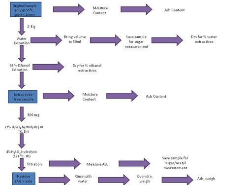 This method is to determine water extractives, ethanol extractives, structural carbohydrates and lignin composition of biomass samples. First extractives are removed from the biomass sample to prevent interference with structural carbohydrate measurement. Then, in quantitative saccharification, the extractives-free biomass samples are subjected to hydrolysis with 72% (w/w) H2SO4 at 30ºC for one hour and subsequently with 4% (w/w) H2SO4 at 121ºC for one hour in an autoclave. The remaining insoluble portion is defined as Klason lignin with ash. These steps are shown in the flow chart to the right.