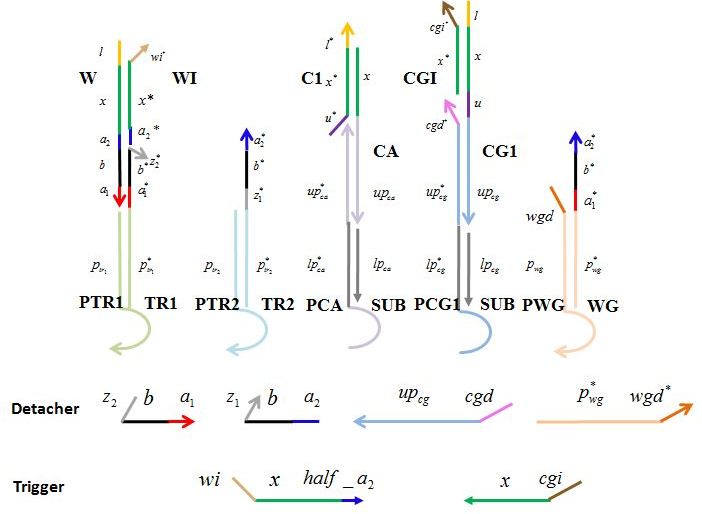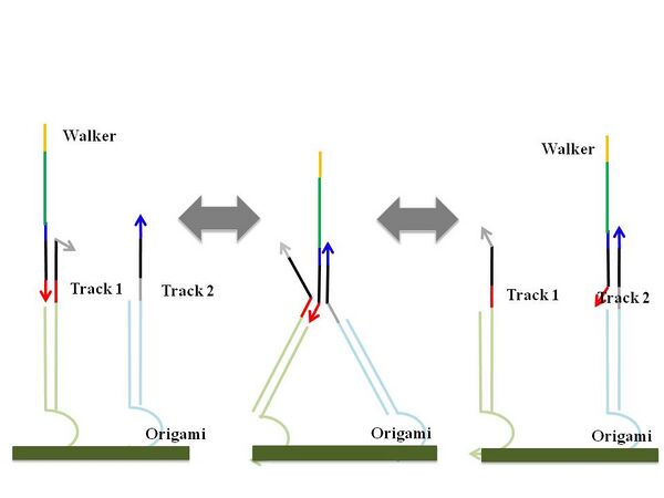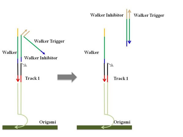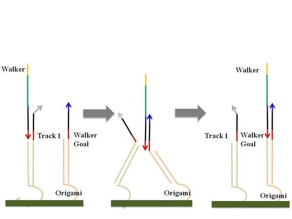 Walking to the Walker Goal Mechanism (for verification of random walking)Another important stand is walker goal. Since walker goal contains both red and blue toeholds which are complementary to the both of the toeholds of the walker, walker stays on the walker goal when it gets there. Walker goal will be used in verifying random walking on origami, and its use will be explained in later section. Triggering MechanismWhile the system is under construction, (e.g. track being planted), a walker or cargo goal should be deactivated to prevent undesired random walking or cargo sorting. Walker inhibitor and cargo goal inhibitor are thus designed. Later, walker trigger and cargo goal trigger will rip off the inhibitors by strand displacement using corresponding toeholds. Walker TriggeringCargo Goal Triggering
