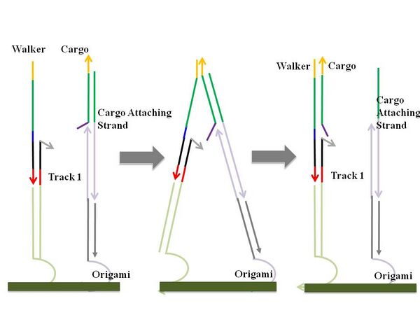 Cargo Pick-Up MechanismTo accomplish a cargo-reorganizing-task, a walker is extended to have picking up arm which is complementary to cargos (green domain). When walker randomly walks and encounters a cargo molecule, it picks up the cargo by strand displacement using yellow toehold. Cargo Drop-Off MechanismIt continues random walking after picking up, and when a walker gets to the cargo goal, cargo is dropped off at the cargo goal using purple toehold, which both cargo and cargo goal share. Therefore, random walking process is purely stochastic, yet a deterministic end result can be achieved by specific recognition between the cargo molecules and their destinations.