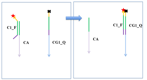 SPEX ExperimentsVerification of Overall Mechanisms in SolutionSee also: SPEX Results Several strands were labeled with fluorophores and quenchers to study there interactions in solution. Walkers were tagged with quenchers while goals for walkers were tagged with fluorophores. The expected reaction is shown below. Cargo strands were tagged with fluorophores and goals for cargo were tagged with quenchers. The expected reaction is shown below. Verification of Random Walking Mechanism on OrigamiFluorescent spectroscopy (SPEX) was used to verify random walk on the origami. We designed a strand named walker goal (WG) which can bind to walkers irreversibly due to its perfect complementarity with walkers. A ROX fluorophore was attached to the 5' end of the probe for the walker goal (PWG) and the corresponding quencher was attached to the 3' end of the walker (Figure 1). When the walker binds to the walker goal, its quencher is directly above the fluorophore of the walker goal, hence quenching it. Thus we can setup experiments where the fluorescent level slowly decreases as more and more walkers reach the walker goal. The overall origami layout was shown in Figure 2.