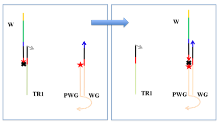 Three different starting positions were chosen, shown in the figures below. Since it is possible for the walkers to undergo space walking (SW), namely dissociating from the origami, binding to free floating tracks in the solution and rebinding to origami, we added a control group in which only one track at the starting position 10 was planted on the origami. Excess of walker triggers were added in the beginning of the experiment to activate the walkers and excess of walkers with quenchers attached were added in the end to stop the reactions.SEPX Results show that fluorescent signals decreased faster when the walkers were planted nearer to goals.