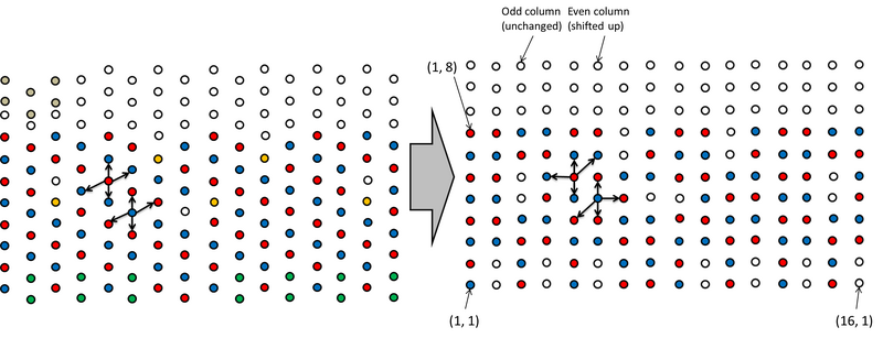 To turn a hexagonal grid into the square one that the grid layout implies, even columns are shifted up by 0.5 in this representation. This leads to the restriction that the first column must be a "high" column, as described in the code's documentation (see below).