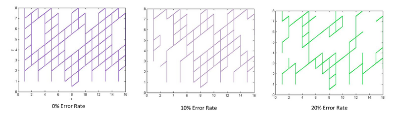 This code can be used to generate diagrams like those below, visualizing the mobility of the walker. One immediate question is the vulnerability of this layout to errors in the laying of track. We investigate this by, when generating the track layout in the beginning of randomWalkFunction, introducing a small (specified by input) percent chance that any single probe will be omitted. Error rates at around 10% are bearable; error rates greater than that, however, are catastrophic, causing walkers to become permanently trapped in small sections of the track field.