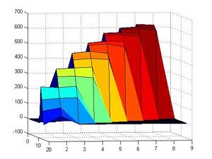 The data we need from this simulator is a rough projection of the fluorescence response from our test of 2D random walking, which should change based on the starting location of the walker. A plot of the number of steps (on an average over 5000 iterations) it takes a walker to random walk from any point on the origami to the irreversible track at one end. This test was done assuming a 0% error rate, on the 3-track-wide linear random walking playground that we are using to investigate random walking (in a pseudolinear environment).Because this fluorescence is changed by a fluorophore-quencher interaction upon a walker reaching its irreversible track, in the case where we plant all of the walkers on the same starting track, the time it takes [math]\displaystyle{ (fluorescence_{initial} - fluorescence_{current}) }[/math] in the sample to reach some standard value should be proportional to the average time it takes the walkers to reach the irreversible substrate. As this 'total steps elapsed' value is one of the outputs of our simulation function, we can generate a map of these average walk durations by running a large number of simulations at each point on the origami and averaging the results: Toggle Code