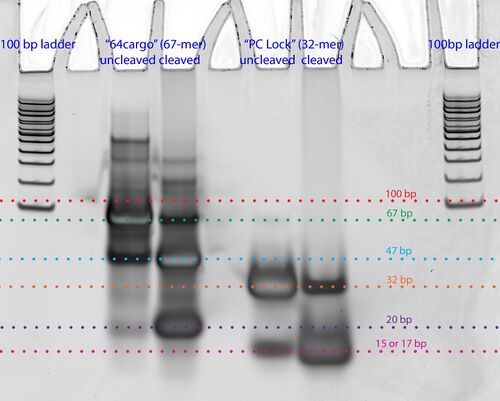 - 10% TBE PAGE gel, 1 hour UV exposure for "cleaved" strands