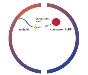 - For the photo-cleavage method, we designed a staple extension into the interior of our containers that contained a region complementary to the DNA bound to our conjugated gold nanoparticles, but also a photo-cleavable spacer prior to the binding site with the gold nanoparticle's DNA strand. Thus, after binding of the AuNP and the subsequent introduction of UV light, the nanoparticle's attachment to the inside of the container would be severed, and the NP would move freely within until subsequent (or simultaneous) opening of the container. (See Figure 2 for a depiction of this process in the sphere.)