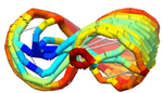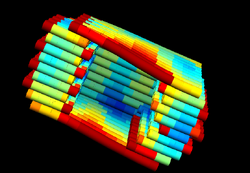 - The CanDo Output above indicates the stability of my structure, where red is indicative of the most flexibility (least stability) in my structure. It is to be expected that the regions of my design that are least supported by staples to nearby helices show the most flexibility, as seen above. One concern I have, however, is whether, if the edges of the opening in my box vibrate too much (after a future cover to be designed is removed), my gold particle cargo will be able to escape from the opening.