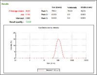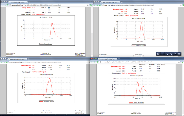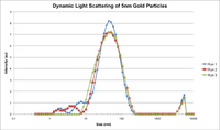- This morning I worked on determining the hydrodynamic radius of five of the species of gold nanoparticles we synthesized yesterday with Steve. Below you will find some data outputs from the DLS machine, which overall showed that the more gold particles from a stock solution of 5nm particles introduced to a given volume of AuCl yielded smaller gold aggregates (more particles = more locations for the aqueous gold to bind, such that an individual pre-formed gold particle will be smaller if there are more pre-formed gold particles in solution:
