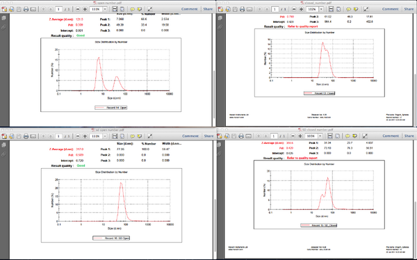 - Again it appears as if the number measurements seem to have the largest sense of a correlation if any, see below for a side-by-side comparison of all four measurements. Here, again, the comparison of the SD_Closed graph (bottom right) with the SD_Open graph (bottom left) and the Closed graph (top right), causes one to believe that the first peak is closed spheres, while the second (and much larger) peak corresponds to spheres that did not close. In this image the relative distribution of the open spheres (top right) even makes sense, but the relative scale does not (or at least not yet...).