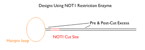 - Today, I also investigated the activity of the Restriction Enzyme NOT1 and began designing a mechanism to incorporate its recognition sequence into the seam of the sphere, in order to facilitate opening of the sphere. In specific, I designed a construct to test whether or not a restriction enzyme motif would be sufficient to open our sphere. Note in the image below, if the hairpin is open we should be able to detect this on a gel, and this will show that a given amount of pre-cut excess is sufficient to allow a R.E. to cut, but short enough such that the sphere could still open after cleavage.