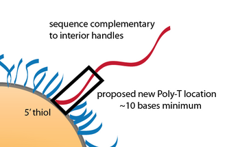 - When designing the strand attached to our gold nanoparticles, we should put the poly-T sequence on the thiolated end, because either the PEGs or the attached Poly-T strands will block access to the first 2-4nm (5-10 bases) of our DNA that we hope to attach to a handle interior to our DNA structures