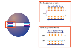 - In order to begin the process of attaching cargo to the inside of our sphere, I worked on isolating the staple strands located along the seam, breaking connections across the seam, and reorienting the locations of these staples such that at the breakpoints they are facing outwards. My ultimate goal is to manipulate these strands so that they may be cleaved by a restriction enzyme (via a specific palindromic sequence), UV light (via the incorporation of azobenzene or a photo cleavable spacer), or via DTT (via the incorporation of a disulfide bond).