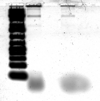- Whilst doing other things, we also ran a series of gels containing samples from yesterday of our attempt to make a nanoparticle chain after we had conjugated some of our particles with DNA complementary to an ultramer strand. While we had a little difficulty managing the thin acrylamide gel the first time, we were able to get a much cleaner result our second time around.