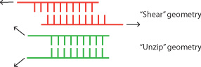 - This morning we talked to Tom about the forces that hybridization of DNA strands can provide on an origami box. According to this paper, the force exerted by a DNA lock in the shear geometry (see below) is ~50 pN. I'm not sure how big this is for a DNA origami box, but according to Tom we can calculate how much 50 pN will cause a DNA lid to bend using the same equations engineers use for buildings, which is pretty cool.