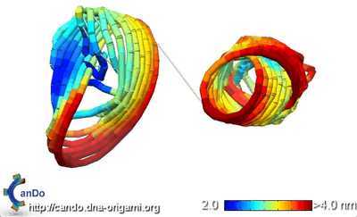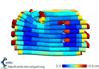 - When sent into CanDo, I got back a video showing thermal fluctuations of >5.5nm. That's expected, since the sides of the box not connected by scaffold are free to swing sideways. The fluctuations between helices look pretty small, so the box shouldn't leak 5nm gold particles between helices. I'm not sure if the scaffold between the two halves is long enough; when the box is in its closed state, will the scaffold bend and allow the box to close seamlessly, or will it resist bending and cause the box to have a gap? Below is a screenshot of the CanDo video.