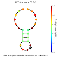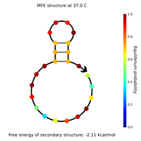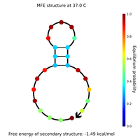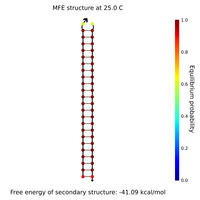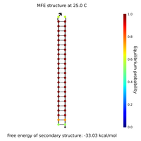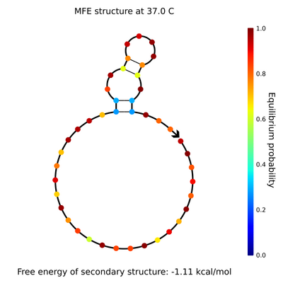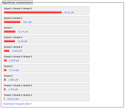 - To do this, I used Nick's spreadsheet to find where staple strands along the sphere's equator face outward on the northern and southern hemispheres, then where these outward strands line up. I also designed tweezers with staple strand extensions, a lock strand, and a key strand complementary to the lock strand. The current sequence I have is taken from the Liang paper, so I assume it will work better than something I randomly generate (but maybe not). I did, however, have to come up with my own addition to the lock and key strands, as the Liang paper doesn't use strand displacement to open the tweezers. Here are the NUPACK results of the lock and key, respectively.