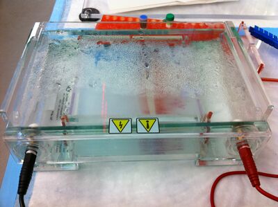 - (The above image was taken the day after the gel was run, so the staples have diffused noticeably through the gel. The usually faint Han et al. sphere band is also no longer visible.)