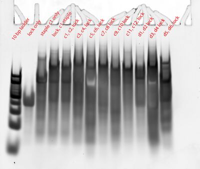 - Ran a gel with the open SD spheres + 8 bp locks in a 2-step closing, but the gel was messed up and all the bands came out smudged, lopsided, and broken. It's weird, because I made the gel the same way I've been making them... I'll have to do it again tomorrow.