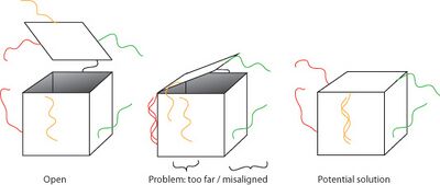 - Tom also brought up a potential problem for assembling the lid: if one lock hybridizes first, it may separate the other sides of the lid from the box such that the other locks can't lock. Then all our boxes will be open, because it's almost guaranteed that one lock hybridizes before the others. One potential solution is to design the lock opposite the lid hinge such that it hybridizes first; another solution is to add the opposite lock strand first, then the side lock strands.