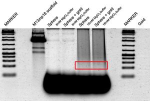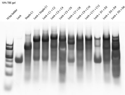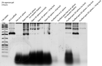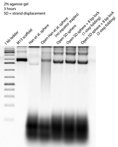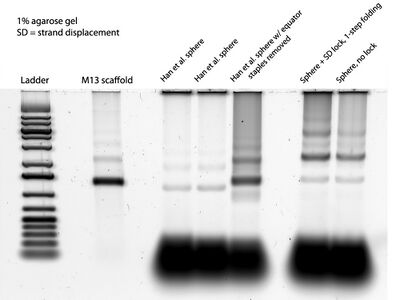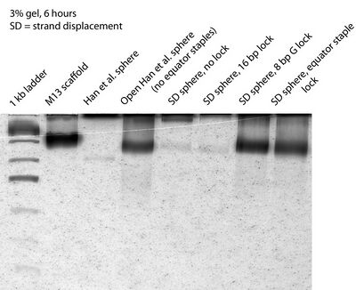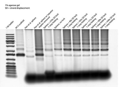 - Interestingly, we see bands shift between the SD sphere (no lock) and the SD sphere w/ 16 bp lock lanes. Previously they had looked the same on gels and we assumed that there was an issue with 16 bp locks closing the sphere. Now it looks like the 16 bp lock may be working; either it worked all along or needed some time sitting around on our lab bench (~2 weeks' worth, since I folded them) to close the spheres.