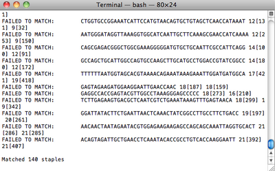 - Continued fixing mismatched staples this morning. Got the number of staple matches up to 142, with 16 staples not matching due to seemingly random base differences (A instead of T) nowhere near crossovers. Not sure why these exist. Also weird is that 142 and 16 add to 158, which is two staples short of the 160 staples Han et al. ultimately used in their sphere. Where'd they go??