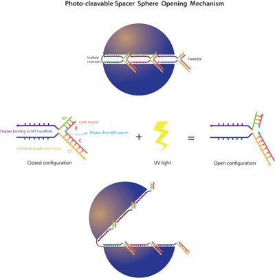 - In the afternoon I made a schematic of the strand displacement/tweezer method for opening the sphere.