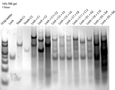 Re-anneal staple:lock:staple complexes with excesses of staples that bind to lock at 5' end- Run gel of above