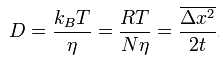 - [math]\displaystyle{ D = \frac{k_\mathrm{B} T}{6\pi\,\eta\,R} }[/math]