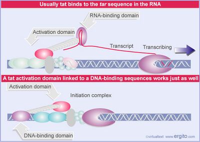 - Tat protein interacts with the Tar region at the 5' end of the viral RNA and is recruited to the promoter, where it keeps the transcription complex intact and allows for continuous transcripts to be produced.