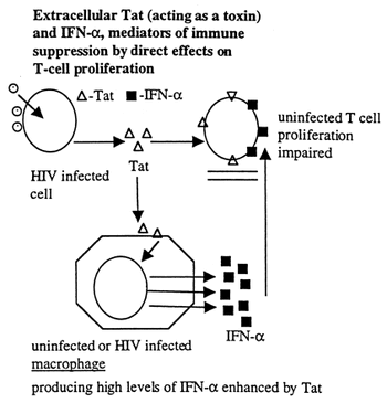 - Tat activates interferon-alpha production from macrophages. IFN-alpha is present in high levels in patients infected with HIV, and is immune suppressive.