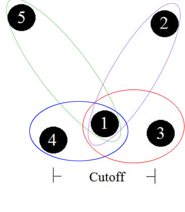 Example: GNM AppliedFrom the image above, there are 5 nodes. Nodes 1,3 and 4 are all within the cutoff distance. Nodes 2 and 5 are not within the cutoff distance. The interactions between these 5 nodes would be defined such that there would be a 5x5 Kirchhoff matrix. Each row would have the interactions corresponding to its node (i.e. row 1 would be interactions for node 1 to all other nodes). Interactions for node 1 are circled and explained below. Assume ai,j is a position in the matrix of row i and column j. For node 1: