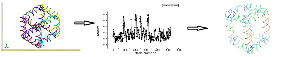 How We Applied GNM to Synthetic DNA1. Structure was built in NanoEngineer-1 and exported as a PDB file. 2. Coordinates (x,y and z) were extracted from the PDB file and saved as an Excel file. 3. Calculations for the matrix were done in MATLAB with code written by our team. The program uses the math described above. The output of the program is a matrix that has fluctuations that correspond to each node. 4. Fluctuation data, with corresponding node number, was again saved as an Excel file. 5. Coloration of the data was done in MATLAB but was also done in PyMOL for better images. The output is an image of the structure with colors that corresponded to the fluctuation of the node. Dark blue was used for nodes with the least amount of flexibility. Red was used for nodes with the most flexibility. In between colors were used to represent that correct fluctuation.