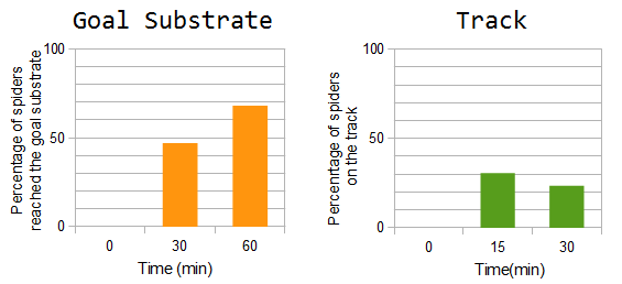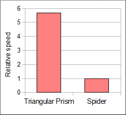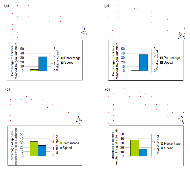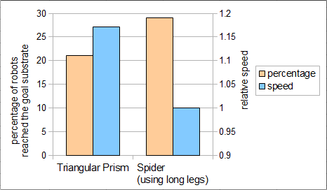 In this section, both robots, triangular prism and a modified molecular spider, were chased in silico on the same field. On this simulation, spider robot has longer legs, while design of triangular prism was the same as the one we used above. Right figure shows moving data of each robot. As a result, the molecular spider with long legs was slower than our robots, although it had more goal probability. It might be due to difference in the body size, leg length and the number of legs. Longer leg increases the probability to reach the goal, making more molecular spiders reach goal. And if the structure has more legs, it can cleave more substrates in the same time. Therefore, when the design of the fields is the same, robots with many legs are fast. This notion explained why the triangular prism was faster when comparing with the molecular spider.