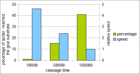 To verify effects of cleavage rates of DNAzyme, simulation of the molecular spider was done by changing cleavage time. Fig.7 is the result from our simulation. Increase of cleaving rate facilitated speed in reaching the goal, but percentage of spiders which reached goal reduced. Therefore, there is a trade-off between increasing the cleaving rate and the percentage of robots that reaches the goal.