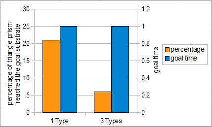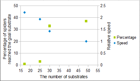 The results by the simulation are shown in the right figure. Less substrates gained speed to reach goal, and decreased probability of goal. But the goal probability depends on not only the number of substrates but also on the location of the substrates.