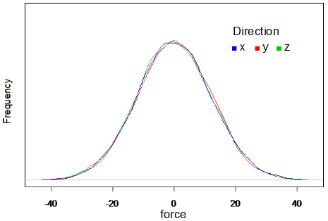 <html></html>The motion of each mass point is described by the Langevin Equation(2). In this equation, acceleration is determined by sum of force F from the differentiation of energy V, viscosity resistance -βv , and white Gaussian random force η(t). White Gaussian random force was obtained by the box-muller methods(3). Distribution of the obtained random force is shown in Fig.2.