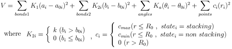 In this simulation, we described the system as a coarse-grained model(1). In a coarse-grained model, representative points of the structures are extracted. In our case, these representative points were connected by springs and strings, and their potentials associated with them.